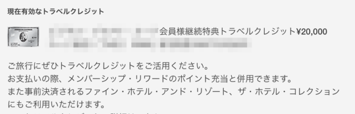アメックスプラチナでは、カード入会時(30,000円)と継続時(20,000円)にトラベルクレジットが付与されます。