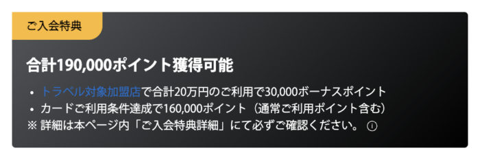アメックスプラチナでは、入会特典として合計190,000ポイントと30,000円分のトラベルクレジットを獲得できます。