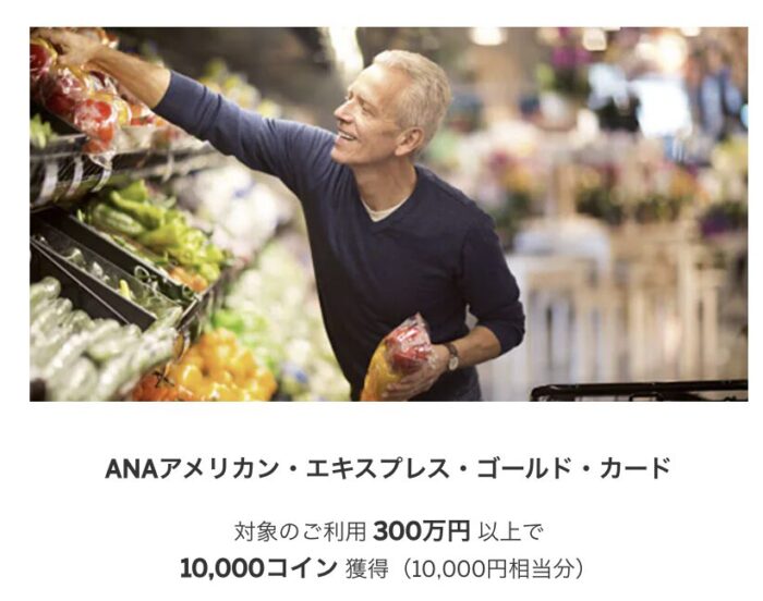 • 毎年、12月31日までに300万円以上ANAアメックスゴールドをご利用いただくと、翌年3月末頃に「ANA SKY コイン」10,000コイン(10,000円相当分)を進呈