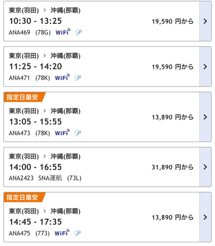 ある日の羽田-沖縄(那覇)の片道料金は、13,890円〜31,890円となっていました。(時期によって12,680円くらいに設定されていることもあります。※セール除く)
