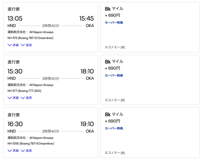 実際に、羽田-沖縄(那覇)の空席を調べてみましたが、8,000マイルで予約をすることが可能です。