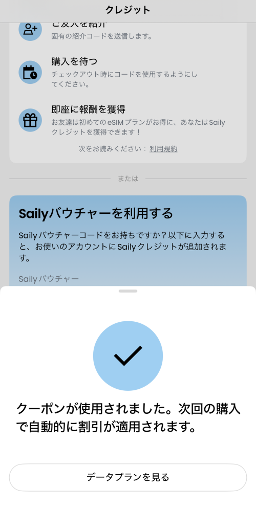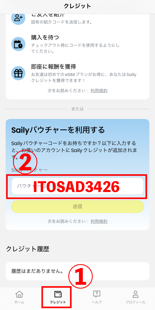 $8の紹介コードの適用は、画面下部の「クレジット」をタップし、「Sailyバウチャーを利用する」に入力して送信を押すだけで利用することができます。