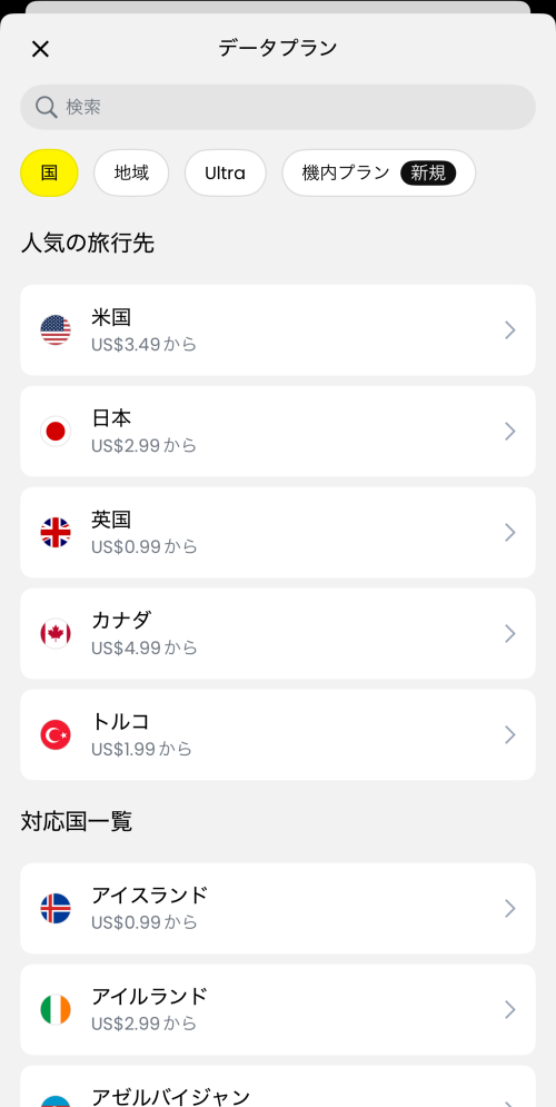 国別プランは短期滞在向けの小容量プランから、長期滞在やデータ利用量の多い方向けの大容量プランまで幅広く対応しています。