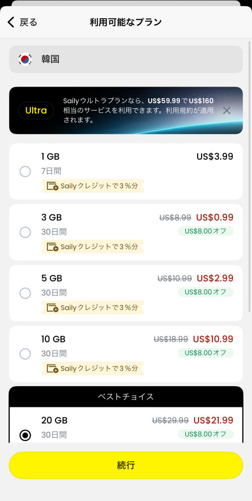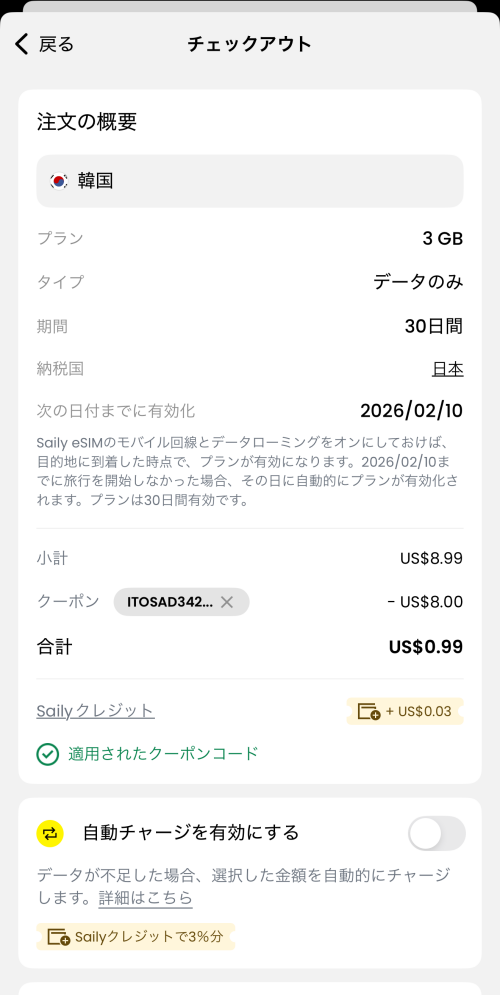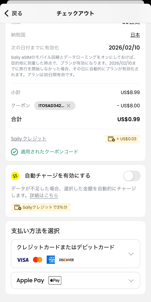 これだけで、US$8割引の特典を受けた状態でSailyを利用できます。