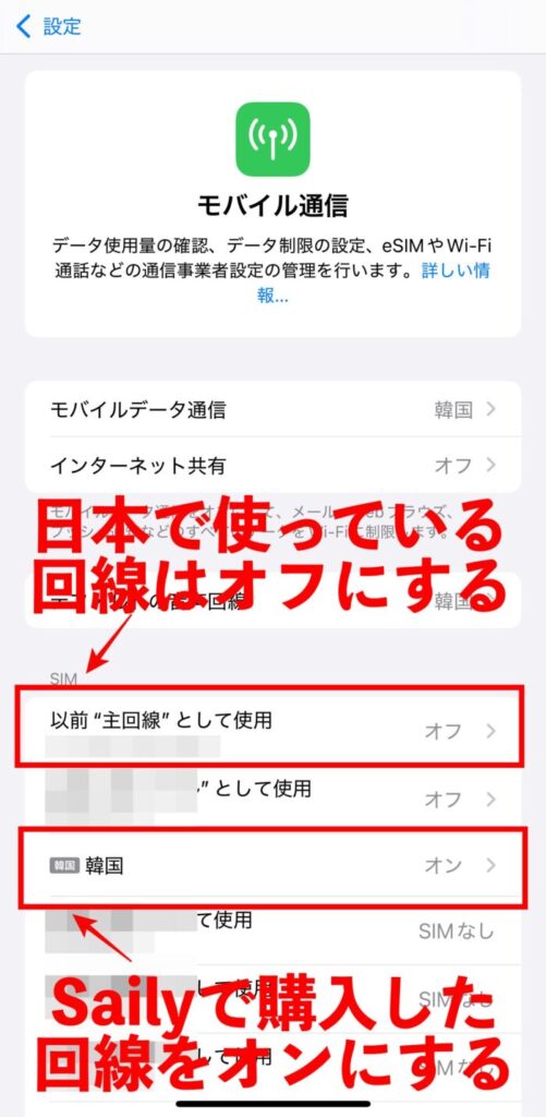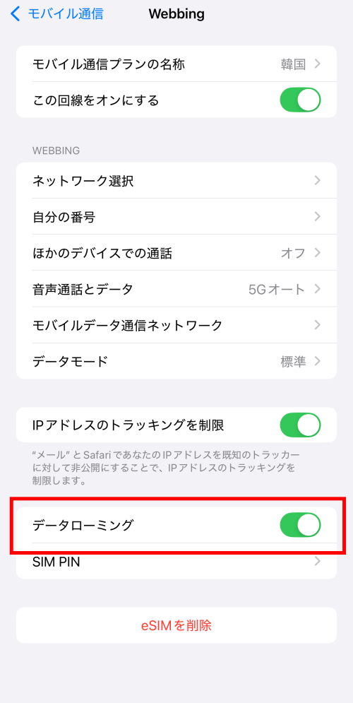 次に、購入したeSIM(※わかりやすく名称を「韓国」に変更してます。)をオンにします。
